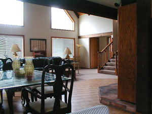 features a modern kitchen, with service for ten, open living areas, a large deck, in a private wooded setting. The main